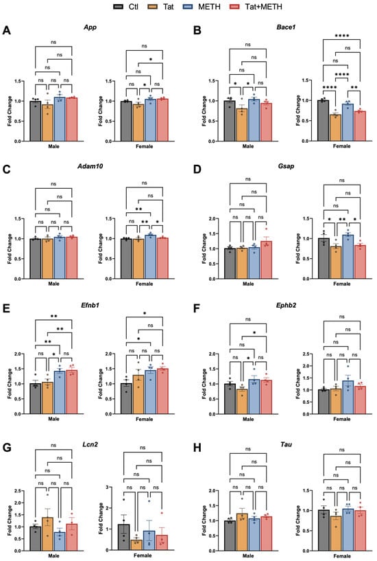 RNA isolated from the cortex was analyzed by qRT-PCR to assess expression of genes involved in neurodegenerative diseases, such as Alzheimer’s disease (AD), since transgenic mouse models of AD show similarly loss of SYP+ neuropil [34]. Here we analyzed mRNA levels for amyloid precursor protein (App), Tau, and genes involved in the amyloid precursor protein (APP) processing pathways, β-amyloid converting enzyme-1 (Bace1), a disintegrin and metalloproteinase domain 10 (Adam10) and γ-secretase activating protein (Gsap) (Figure 5A–D,H). In addition, we assessed ephrin-B1 (Efnb1), ephrin receptor B2 (Ephb2), and lipocalin-2 (Lcn2) which are implicated in inflammation (Figure 5E-G)). Results are shown separately for male and female animals in Figure 5, but combined analysis and differences between female and male expression (normalized to Ctl male) were also analyzed (Figure S3). In female cortex, expression of App was higher in the METH compared to the Tat-only group and again in the Tat + METH animals, but no significant changes were observed in males (Figure 5A). Bace1 expression was decreased in males of the Tat group compared to Ctl and METH animals (Figure 5B). The females showed a similar pattern in changes of Bace1 expression but more robust, with Tat and Tat + METH dropping expression to levels lower than in Ctl or METH animals (Figure 5B). Expression of Adam10 was not changed in male animals. However, in female animals, Adam10 expression was higher in the METH animals compared to all three other groups (Figure 5C). The mean fold-change (FC) of expression of Adam10 in the female Tat + METH group compared to Ctl is closer to the increase seen in the female METH than the Tat-alone group. Male animals showed no significant changes in expression of Gsap (Figure 5D), whereas in females, Tat and Tat + METH animals showed similar and lower expression of Gsap compared to Ctl and METH groups (Figure 5D). Expression of Efnb1 in males of the Tat + METH group reached the same level as in METH animals, higher than in Ctl or the Tat group. A similar pattern was seen in female animals (Figure 5E). Ephb2 expression was increased in males in METH and Tat + METH groups compared to the Tat animals, but largely unchanged in females (Figure 5F). The variability in Lcn2 expression is seen in both male and female animals. Though the changes were n.s., the pattern of expression is different in animals expressing Tat and those exposed to METH (Figure 5G). The expression of Tau was largely unchanged, though males and females showed a different pattern between groups (Figure 5H). Overall, Tat and METH exposure seem to have a limited effect on the here tested genes, except for Bace1 and Efnb1 in both sexes and Gsap in females.