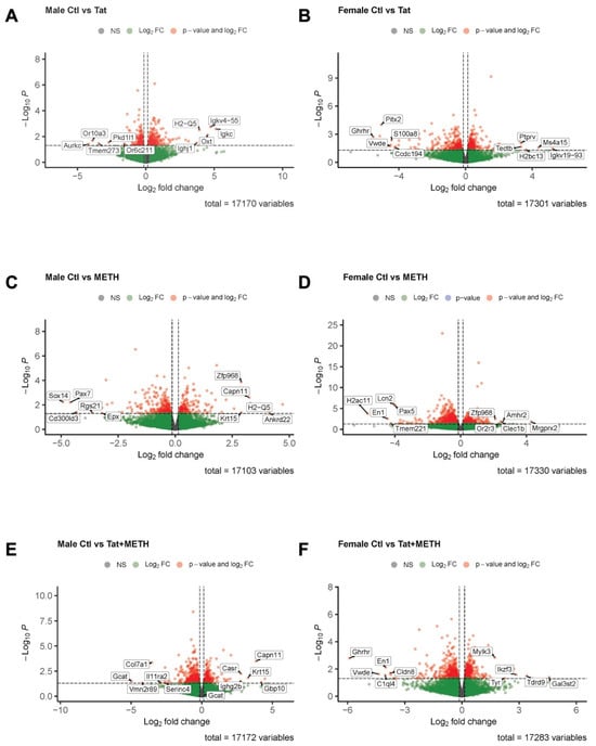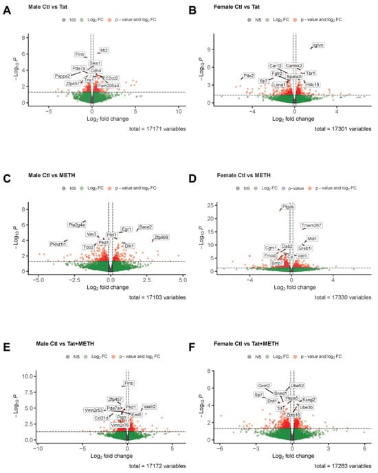 Since the qRT-PCR analysis of cortical mRNA revealed only relatively minor changes, we turned our attention to the hippocampus. However, the RNA quantity isolated from the hippocampus was more limited than that from cortex. Therefore, we decided for this study to utilize hippocampal mRNA for bulk RNA-sequencing (RNA-seq) in order to assess modulation of gene expression by Tat, METH, and Tat + METH. The data for the experimental groups were analyzed first separately by male/female groups and gene expression compared to the respective sex-specific Ctl groups (Figure 6 and Figure 7, Tables S1 and S2). In addition, combined group analysis was also performed to distinguish the sex-independent from sex-dependent effects in gene expression (Figures S4 and S5, Table S6).