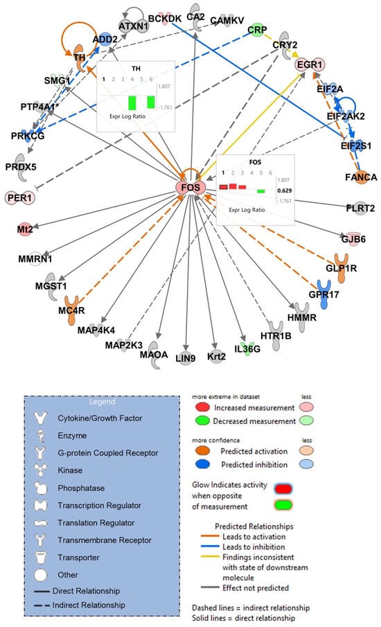 IPA was further used to predict networks which were significantly affected. One of the top networks observed indicated strong modulation of Fos as a key transcriptional regulator and tyrosine hydroxylase (Th) although these two genes were not among the 10 most significantly up- or downregulated genes as judged by p-value or FC (Figure 8). Expression of Th was reduced in female Tat and female Tat + METH animals compared to female Ctl. Expression of Fos was increased in male Tat, male METH, and male Tat + METH animals compared to male Ctl. On the other hand, expression of Fos was decreased for female METH animals compared to female Ctl. Overall, modulation of Fos is more affected in male animals, with increased expression, whereas expression of Th is highly affected in female animals expressing Tat.
