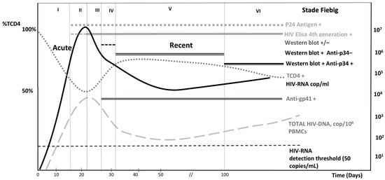 - Fiebig, E.W.; Wright, D.J.; Rawal, B.D.; Garrett, P.E.; Schumacher, R.T.; Peddada, L.; Heldebrant, C.; Smith, R.; Conrad, A.; Kleinman, S.H.; et al. Dynamics of HIV viremia and antibody seroconversion in plasma donors: Implications for diagnosis and staging of primary HIV infection. AIDS 2003, 17, 1871–1879. [Google Scholar] [CrossRef]