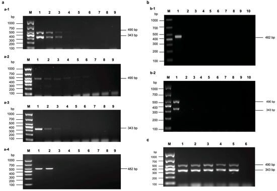 The results of the sensitivity measurement indicated that the optimized multi-gene combined RT-PCR assay exhibited a high level of sensitivity, successfully detecting MDMV cDNA at dilutions as low as 10−4 (Figure 1(a-1)). When MDMV-CI-490 was used for independent detection, the lowest detectable dilution was 10−5 (Figure 1(a-2)), while for MDMV-CP-343, the lowest detectable dilution was 10−3 (Figure 1(a-3)). In comparison, the sensitivity of conventional RT-PCR was also evaluated, and the results showed that MDMV cDNA could only be successfully detected up to a dilution of 10−1 (Figure 1(a-4)). The concentration of the RNA stock solution was measured at 53.7 ng/μL, which indicates that the lowest detection limit of the optimized multi-gene combined RT-PCR assay was 5.37 pg/μL. These findings confirmed that the multi-gene combined RT-PCR assay has high sensitivity.