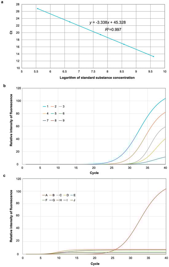 The plasmid concentration was determined and used as a standard for subsequent experiments. The number of plasmid copies was calculated using the formula: (copies/μL) = [6.02 × 1023 × (plasmid concentration (ng/μL) × 10−9)]/[plasmid length (bp) × 660].