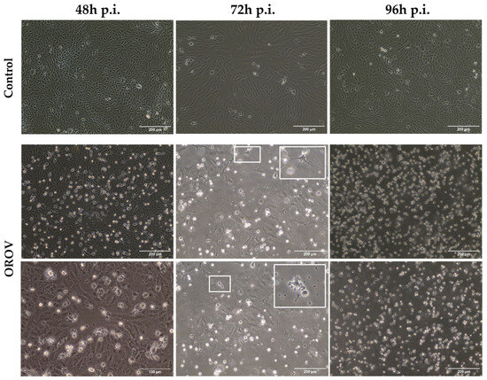 Monolayers of Vero cells in control conditions and infected with Oropouche virus (OROV) at 48, 72, and 96 h post-infection (h p.i.). Bright-field microscopy analysis revealed conformational changes in the membrane as the infection progresses, including the formation of projections and membrane partitioning (insets), which are indicative of apoptosis.