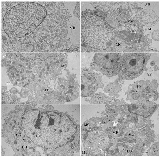 Cytopathic effects in Vero cells infected with Oropouche virus—cellular response and damage. (A) Uninfected Vero cell. Membrane blebbing (MB). (B–F) OROV-infected cells. (B) Apoptotic bodies (AB), cytoplasmic vacuoles (CV), mitochondrial clustering (MC). (C) Filopodia formation (FF), mitochondrial clustering (MC). (D) Apoptotic bodies (AB), pyknotic nucleus (PN). (E) Mitochondrial cristae disorganization (CD), hypercondensation of chromatin (HC). (F) Lipid droplets (LD), mitochondrial clustering (MC), myelin figure (MF), multilamellar bodies (ML).