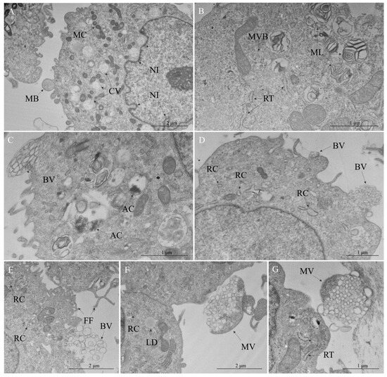 Cytopathic effects in Vero cells infected with Oropouche virus—membrane remodeling. (A) Cytoplasmic vacuoles (CV), plasma membrane blebbing (MB), mitochondrial clustering (MC), nuclear membrane invagination (NI). (B) Multilamellar body (ML), multivesicular body (MVB), rough endoplasmic reticulum (RER) thickening (RT). (C) Autophagy components (AC), budding vesicles (BV). (D) Budding vesicles (BV), RER cisterns (RC). (E) Budding vesicles (BV), filopodia formation (FF), RER cisterns (RC). (F) Lipid droplet (LD), multivesicular cargo (MV), RER cisterns (RC). (G) Multivesicular cargo (MV), RER thickening (RT).