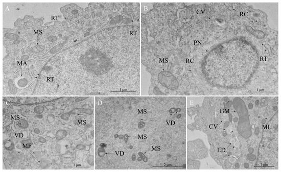 Cytopathic effects in Vero cells infected with Oropouche virus—rough endoplasmic reticulum (RER) and mitochondrial stress. (A) Mitophagy (MA), mitochondrial swelling (MS), RER thickening (RT). (B) Cytoplasmic vacuole (CV), mitochondrial swelling (MS), pyknotic nucleus (PN), RER cisterns (RC), RER thickening (RT). (C) Myelin figures (MF), mitochondrial swelling (MS), vacuolar degeneration of mitochondria (VD). (D) Mitochondrial swelling (MS), vacuolar degeneration of mitochondria (VD). (E) Cytoplasmic vacuole (CV), giant mitochondria (GM), lipid droplets (LD), multilamellar bodies (ML).
