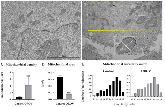 Morphometric analysis of the mitochondria. (A) Micrograph of the uninfected cell. (B) Micrograph of the OROV-infected cell culture to illustrate morphometric procedure. All mitochondria were counted, excluding those that were not fully within the field (black arrow). For the mitochondrial density of each micrography, the evaluated areas (yellow rectangle) were defined as the boundary surrounding the outermost mitochondria (yellow crosses). The cross-sectional area (black dashed line) and minor and major axes (continuous and dashed white line, respectively) were measured in all mitochondria (C) Mitochondrial density of 20 micrographs per group. Median: 0.29 mitochondria/μm2 (95% CI, 0.25–0.31)—control group), and 1.78 mitochondria/μm2 (95% CI, 1.27–2.3)—OROV-infected group. The data presented in panels (C,D) correspond to the micrographs totaling 500 mitochondria per group (control and OROV-infected). (D) Mitochondrial cross-sectional area. Median: 0.37 μm2 (95% CI, 0.32–0.36)—control group, and 0.08 μm2 (95% CI, 0.07–0.08)—OROV-infected group. **** p < 0.0001—Mann–Whitney test. (E) Distribution of the frequencies of mitochondrial circularity index. The y-axis indicates the number of mitochondria located within the circularity index range specified by the center bins on the x-axis. Median: 0.72—control group, and 0.68—OROV-infected group.