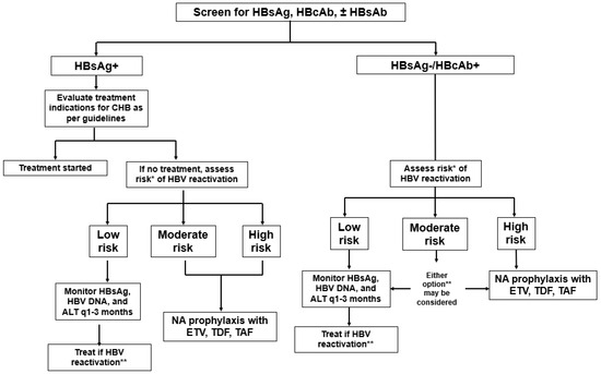 Professional society management guidelines from a variety of medical subspecialties have uniformly recommended HBV screening (HBsAg and anti-HBc) prior to initiating immunosuppressive therapy (Figure 1) [2,5,10,12]. However, universal HBV screening inclusive of HBsAg, anti-HBc, and anti-HBs has been recommended by the U.S. Centers for Disease Control (CDC) since March 2024 for all U.S. adults [15]. A positive serologic marker (HBsAg and/or anti-HBc) should be followed up with an HBV DNA viral level. Hepatitis B surface antibodies can also be assessed, and patients are offered vaccination if non-immune. In clinical practice, patients who are identified to have CHB (HBsAg positive) should undergo a complete evaluation, including baseline HBV viral load, ALT level, HBeAg and HBeAb status, serologic evaluation for co-infections (HIV, HCV, HDV), and an assessment of underlying fibrosis to determine any indications to start NA therapy regardless of any planned immunosuppressive therapy. The indication for antiviral therapy in CHB outside the setting of immunosuppressive therapy is beyond the scope of this review but has been addressed by practice guidelines [2,10].