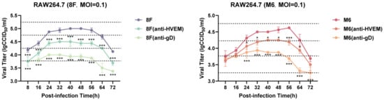 3.1. HSV-1 M6 Attenuated Strain Infects Macrophages Primarily via Its Membrane gD Protein Binding to HVEM