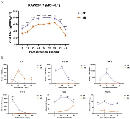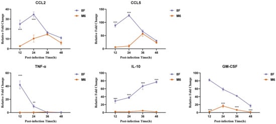 3.3. Compared to the Wild-Type Strain, the Attenuated Strain M6 Exhibits Similar Proliferation Dynamics in Macrophages but Induces Lower Levels of Immune Signaling Molecules