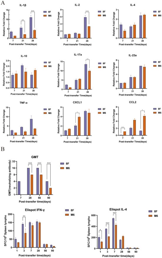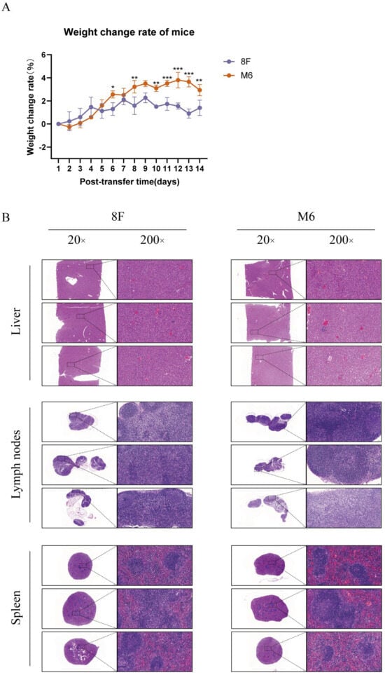 3.5. The Attenuated M6 Strain Induces Host-Specific Clinical Pathological Changes in Macrophages