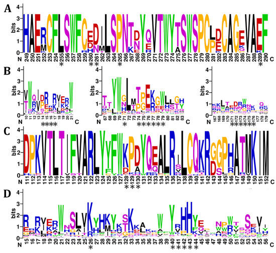 Amino acid sequence logos. All sequences are shown here with heights based on their conservation across alignments of all species across different proteins. Asterisks denote known residues that interact with their targets with either an APOBEC [4] or with Vif [41], respectively. The sequences are A3F denoting Vif-binding sites (A), three charts of Vif with A3G-binding sites (B), A3G with Vif-binding sites (C), and Vif with A3G-binding sites (D). Figure created in WebLogo.