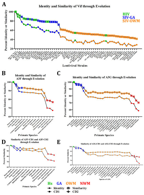 Across species, the dynamic interactions between viruses and host organisms represent an ongoing evolutionary arms race, shaped by long periods of host–virus coevolution. This intricate relationship is particularly well studied in retroviruses where host restriction factors, such as those in primates, evolve to inhibit viral elements, while lentiviral proteins adapt to circumvent host defenses [1,2,3]. A prominent example of this interplay is the interaction between the host mutational enzyme apolipoprotein B mRNA editing enzyme catalytic polypeptide-like 3 (APOBEC3 or A3) and the lentiviral viral infectivity factor (Vif) [4]. APOBEC3 proteins act as restriction factors that induce mutations in viral genomes, while Vif counteracts their effects by targeting APOBEC3 proteins for degradation through the ubiquitination pathway. Lentiviruses are found in a wide range of animals, including ruminants, equines, felines, and primates, though notably absent in New World monkeys (NWMs) [5]. The zoonotic transmission of these viruses from one host species to another involves three critical steps: (1) exposure to the virus, (2) spillover into a new host species, and (3) establishment and spread within the new host population [6]. Successful transmission depends on the virus’s ability to recognize host cell receptors for entry and evade host innate restriction factors. Human immunodeficiency virus (HIV) exemplifies this process. HIV-1 originated from simian immunodeficiency virus (SIV) strains found in chimpanzees (Pan troglodytes) and gorillas (Gorilla gorilla), while HIV-2 originated from SIV strains infecting sooty mangabeys (Cercocebus atys). While SIV has crossed into humans on at least 11 occasions, only since the 1970s has it given rise to the epidemic forms of HIV [7,8,9,10,11]. In contrast, SIV has been infecting great apes (GAs) and Old World monkeys (OWMs) for at least 30,000 years, resulting in diverse clinical outcomes depending on the host species [12]. This evolutionary backdrop provides a unique framework to study the cellular and molecular interactions that govern host–virus dynamics.