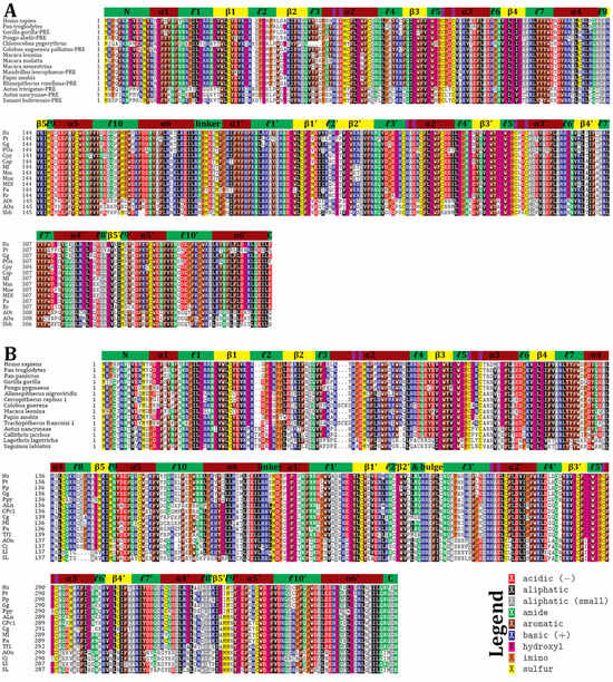 Primates are categorized into three taxa: great apes (GAs), Old World monkeys (OWMs), and New World monkeys (NWMs). We hypothesized that alignments of A3F and A3G would show evolutionary adaptations while maintaining functionality. Alignments included 15 species for A3F (4 GAs, 8 OWMs, and 3 NWMs) (Figure 5A) and 15 species for A3G (5 GAs, 6 OWMs, and 4 NWMs) (Figure 5B). Additionally, 38 A3G sequences were identified with 23 additional OWM sequences (Figure S4). Adaptations were most pronounced between GAs and NWMs, separated by 33 million years of evolution, yet each species retained unique adaptations within otherwise conserved regions [49,53]. A key feature distinguishing A3F-CD1, A3F-CD2, and A3G-CD1 (A3Z2A subtype) from A3G-CD2 (A3Z1 subtype) is the presence or absence of specific motifs. A WF motif in α-helix 2, five residues after the catalytic glutamate, and an RI/RL motif at the start of ℓ7 characterize these subtypes [169]. Variations include a shift to RF in A3F-CD1 of some OWMs (e.g., macaques and Rhinopithecus roxellana) and an RI motif in A3G-CD1 of Saguinus labiatus.