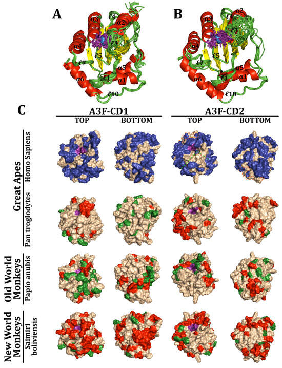 To understand the impact of sequence diversity on the 3D structures of A3F and A3G, we examined structural variations across species. Prior research established that human APOBEC3 proteins share a similar overall structure, including insights into A3F-CD2’s DNA-binding mechanism, the positioning of its catalytic residues, and the Zn2+ cofactor pocket [79,81,82,104]. Furthermore, the negative patch on α-helices 2′, 3′, and 4′, which interacts with HIV-1 Vif, is also well characterized. However, structural data for A3F-CD1 and the Z2a subtype, which includes A3BD-CD1, were absent at the project’s onset [80]. Thus, insights were inferred from related Z2 domains, such as A3C and A3G-CD1. We hypothesized that while Vif-binding regions might exhibit significant variation across taxa, the DNA-binding and oligomerization sites would remain relatively conserved.