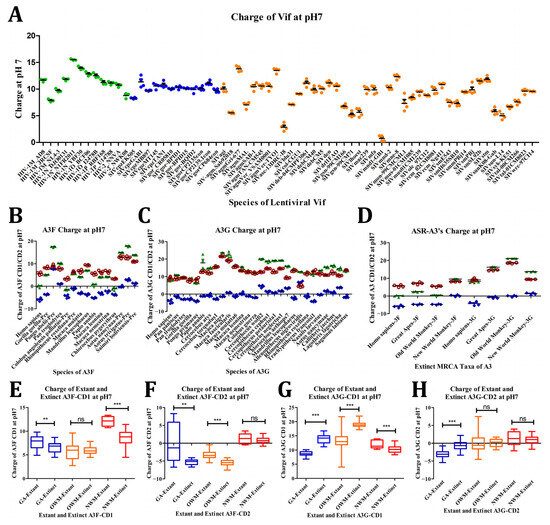 Charge of Vif and APOBEC3FG. The charge of Vif (A), A3F (B), A3G (C), and A3FG ASR models (D) at pH7. Vif (A) graph is coloured by HIV/SIV host with humans (green), great apes (blue), Old World monkeys (orange), and New World monkeys (red), while A3FG models are coloured by domain with CD1 (red), CD2 (blue), and double domain (green). The charges of extant and extinct ASR models were produced for A3F-CD1 (E), A3F-CD2 (F), A3G-CD1 (G), and A3G-CD2 (H), where they are coloured by taxa with great apes (blue), Old World monkeys (orange), and New World monkeys (red). [ns = not significant, *** p < 0.0001, (E) ** p = 0.0019, (F) ** p = 0.0024].