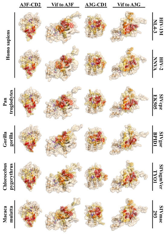 The dynamic interplay between host APOBEC3 proteins, viral Vif, and viral nucleic acids highlights the evolutionary arms race that shape host–virus interactions relative to both zoonotic and the following intraspecies transmissions. These coevolutionary pressures have driven the diversification of APOBEC3 proteins in primates and lentiviral adaptations to overcome host defenses. By utilising multifaceted computational approaches to examine the structural and evolutionary variations in A3F, A3G, and Vif across primates and their lentiviruses, we can gain deeper insights into the mechanisms underlying viral zoonosis and host immunity [92]. Although structural computational approaches are only one way of expanding on this diversification, it allows us to observe interactions that have yet to be resolved through more traditional means. Computational approaches, such as those used by King et al., which were solved 2 years prior to the X-ray crystal structure, have proven valuable in predicting protein structures and interactions, offering a framework for studying these complex interactions [93,94,95]. This paper aims to extend our understanding of APOBEC3 proteins and their role in shaping the evolutionary dynamics of host–virus relationships.