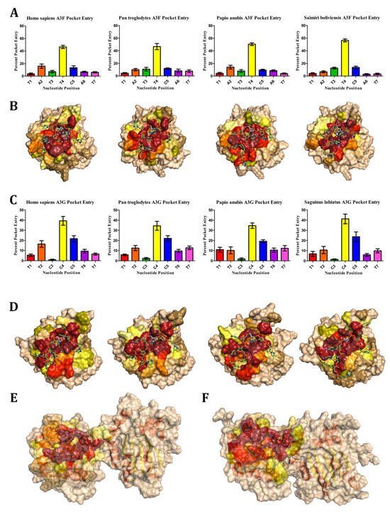 DNA-APOBEC interactions. Analysis of which nucleotide remained in the catalytic pocket most often in A3F species (A) and A3G species (B). Structural heatmaps of DNA-APOBEC interactions when deoxycytidine is in the catalytic pocket, shown with representatives of the DNA on the surface bound to A3F [left to right: Homo sapiens, Pan troglodytes, Papio Anubis, Saimiri boliviensis] (C), and A3G [left to right: Homo sapiens, Pan troglodytes, Papio Anubis, Saguinus labiatus] (D). The heatmap of interaction levels with DNA coloured spectrum from 100% to 0% as ruby, firebrick, red, orange, bright orange, yellow orange, light orange, tv yellow, pale yellow, olive, sand, and wheat. Heatmaps of human double-domain A3F (E) and A3G (F) are also shown using the heatmap data available from the single domain human heatmaps.