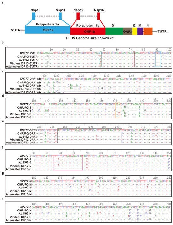 Nucleotide deletions and insertions in the genome of PEDV CHFJFQ compared to CV777, AJ1102, and DR13. (a) Blue strip: Polyprotein 1a and non-structural proteins 1–11; red strip: polyprotein 1b and non-structural proteins 12–16; green strip: spike protein (S); brown: ORF3; yellow strip: envelope protein; purple strip: membrane protein; orange strip: nucleocapsid protein. (b) Compared to the CV777 strain, 5 nucleotides were deleted, and 1 nucleotide was inserted in the 5′ UTR of CHFJFQ, AJ1102, virulent DR13, and attenuated DR13. (c) Compared to the CV777 strain, a 24-nucleotide deletion was observed in the ORF1a/b region of both the CHFJFQ and attenuated DR13 strains. (d) Compared to the CV777 strain, CHFJFQ and attenuated DR13 strains showed a 3-nucleotide deletion in the S gene, while AJ1102 exhibited a 6-nucleotide deletion and 3-nucleotide insertion in the S gene. (e) Based on the CV777 strain, a 49-nucleotide deletion was observed in the ORF3 region of both CHFJFQ and attenuated DR13. (f) Compared to CV777, CHFJFQ, AJ1102, and virulent DR13 strains, a 21-nucleotide deletion was observed in the E gene of the attenuated DR13 strain. (g,h) No nucleotide deletions or insertions were observed in the M or N gene of the CV777, CHFJFQ, AJ1102, virulent DR13, and attenuated DR13 strains. Sequence alignment was performed using BioEdit software (Version 7.0.9.0), with ClustalW multiple alignment selected (Full Multiple Alignment, Bootstrap NJ Tree, number of bootstraps set to 1000).