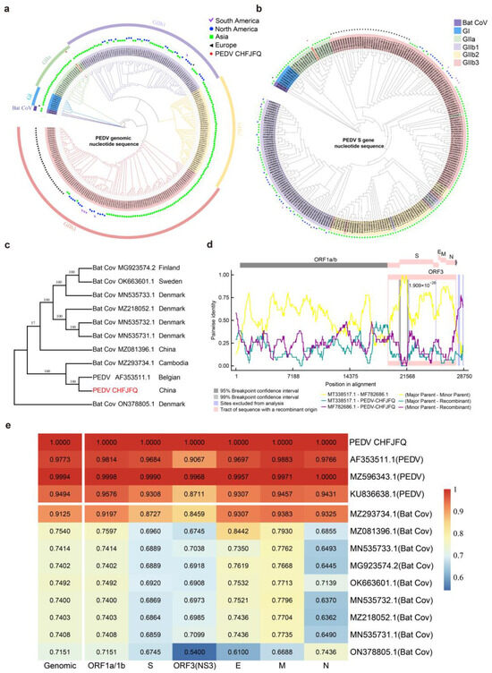 The distribution of PEDV genogroups showed regional variations. Asia encompassed all PEDV subgroups, while the epidemic strains in South and North America predominantly belonged to the GIIb1 and GIIb3 subgroups. In Europe, the predominant subgroup for the epidemic strains was GIIb3 (Figure 2a,b). PEDVs share a common ancestor with bat coronaviruses (Figure 2a,c). The data also suggest that PEDV CHFJFQ may be a recombinant strain, with CH/HNXX/2016 as the major parent and NW17 as the minor parent (Figure 2d). The recombination region spans from the 3′ end of ORF1a/b to the end of the N gene (Figure 2d). PEDV CHFJFQ shows 91.25% genomic nucleotide similarity and 95.4% amino acid similarity with a bat coronavirus (PREDICT/GCS-011, GenBank accession MZ293734.1) isolated from Cambodia. The nucleotide similarities between these two viruses in various genes were as follows: ORF1a/1b (91.97%), S (87.27%), ORF3 (84.59%), E (93.07%), M (93.83%), and N (93.25%) (Figure 2e, Table 1). Therefore, PEDVs and the bat coronavirus PREDICT/GCS-011 can be considered conspecific. Additionally, the nucleotide similarity between the bat coronaviruses analyzed and PEDV CHFJFQ ranged from 71.51% to 91.25% (Figure 2e). These bat coronaviruses were primarily distributed in Switzerland, Finland, Denmark, Cambodia, and China (Figure 2c). Among PEDV strains, PEDV CHFJFQ showed the highest nucleotide similarity (99.94%) with the Chinese isolate SD 2019 (GenBank accession MZ596343.1) (Figure 2e) and the lowest similarity (94.94%) with the British isolate YorkS-2000 (GenBank accession KU836638.1) (Figure 2e). The genomic nucleotide similarity between PEDV CHFJFQ and PEDV CV777 (GenBank accession AF353511.1) was 97.73%, with nucleotide similarities in ORF1a/1b, S, ORF3, E, M, and N between these two strains being 98.14%, 96.84%, 90.67%, 96.97%, 98.83%, and 97.66%, respectively (Figure 2e).