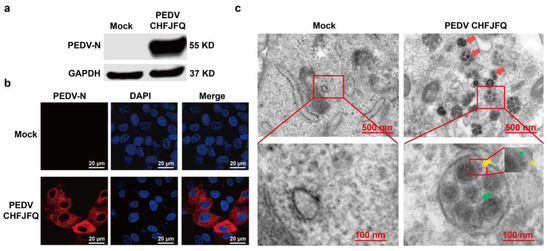 Vero cells (5 × 105 per well) were infected with PEDV (MOI = 0.01) and cultured in 6-well plates. At 48 h post-infection (hpi), the culture medium was discarded, and the cells were washed twice with PBS. The cells were then collected and fixed in 2.5% glutaraldehyde (G1102, Servicebio, Wuhan, China) at 4 °C for 2 h. After fixation, the cells were transferred to a 1.5 mL centrifuge tube. Transmission electron microscopy (TEM) sample preparation was carried out by Servicebio (Wuhan, China), and images were captured using a TEM platform (HITACHI, model H-7650).