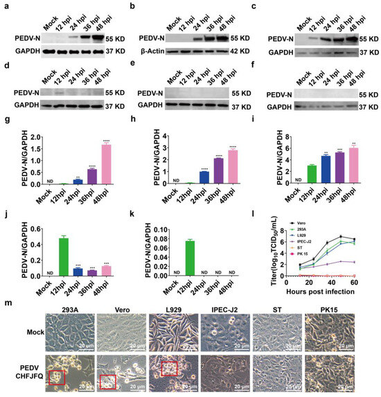 Proliferative characteristics of PEDV CHFJFQ in vitro. (a–f) The expression of PEDV N protein in 293A, Vero, L929, IPEC-J2, ST, and PK15 cells was detected by Western blotting at various time points post-infection (n = 3). Six cell lines (5 × 105 cells per well) were co-cultured with PEDV CHFJFQ (MOI = 0.1) in 6-well plates. Cells were harvested at 12, 24, 36, and 48 h post-infection (hpi), and total protein was extracted for Western blot analysis. Anti-PEDV N protein antibody was used to detect PEDV N protein expression, and GAPDH or β-actin was used as endogenous controls. (g–k) The relative expression of PEDV N protein in relation to GAPDH or β-actin from (a–e) was analyzed using ImageJ (v.1.8.0) (n = 3). (l) Viral titers at different time points of PEDV infection in 293A, Vero, L929, IPEC-J2, ST, and PK15 cells. Six cell lines (5 × 105 cells per well) were co-cultured with PEDV CHFJFQ (MOI = 0.1) in 6-well plates. The culture supernatants were harvested at 12, 24, 36, and 48 hpi, and the virus titers were determined using the Spearman–Kärber method (n = 3). (m) Cytopathic effects were observed by microscopy and photographed at 48 hpi of PEDV CHFJFQ infection. The red box highlights the cytopathic effects caused by PEDV CHFJFQ infection. Unpaired t-tests (GraphPad Prism 5.0, GraphPad Software, San Diego, CA, USA) were used to test differences between groups. Data are presented as means ± standard error of the mean for each treatment. ** p < 0.01, *** p < 0.001, and **** p < 0.0001 vs. control group (12 hpi); ND: none detected. Sample sizes are indicated in brackets. The full-length blots are presented in Supplementary Figure S7.
