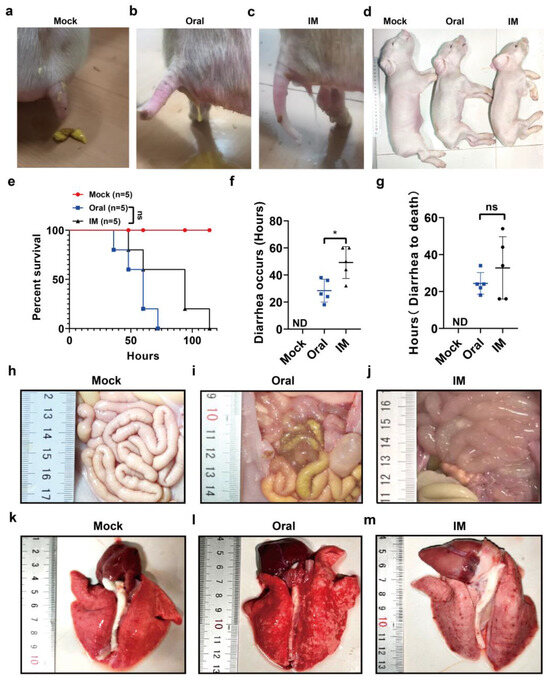 Clinical symptoms and survival of piglets challenged with PEDV CHFJFQ. (a–c) Both oral and intramuscular inoculation of PEDV CHFJFQ resulted in diarrhea. (d) Dehydration was observed in piglets following both oral and intramuscular inoculation of PEDV CHFJFQ (60 hpi). (e) Survival curves of piglets challenged with PEDV CHFJFQ (n = 5). (f) Time to onset of diarrhea following inoculation with PEDV CHFJFQ (n = 5). (g) Time to death in piglets due to diarrhea (n = 5). (h–j) Oral or intramuscular inoculation of PEDV CHFJFQ caused intestinal thinning in piglets. (k–m) Pulmonary hemorrhage was observed in piglets following oral or intramuscular inoculation with PEDV CHFJFQ. The control group was inoculated with 1 mL of DMEM via oral and intramuscular injection, respectively. The oral and intramuscular inoculation groups received 1 mL of 5 × 106 TCID50 PEDV CHFJFQ. The health status of the piglets was monitored every 3 h, and the experiment was terminated when piglets were unable to stand or eat. Data were analyzed using the Mantel–Cox test (e), and unpaired t-tests (f,g) (GraphPad Prism 5.0, GraphPad Software, San Diego, CA, USA) were used to test differences between groups. Data are presented as means ± standard error of the mean for each treatment. * p < 0.05 vs. control group (oral), ns: p > 0.05 vs. control group (oral), ND: none detected. Sample sizes are indicated in brackets.