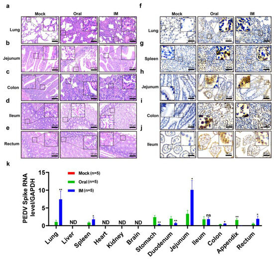Pathological changes induced by PEDV CHFJFQ and its distribution in piglets. (a) PEDV CHFJFQ causes thickening of the alveolar walls and pulmonary inflammation in piglets. (b) PEDV CHFJFQ induces villous atrophy and epithelial cell shedding in the jejunum of piglets. (c) The colon of a piglet inoculated with PEDV CHFJFQ shows diffuse atrophic enteritis. (d) PEDV CHFJFQ leads to the shedding of villous epithelial cells in the ileum of piglets. (e) Intramuscular inoculation of PEDV CHFJFQ induces shedding of rectal villus epithelial cells in piglets. (f–j) Immunohistochemical analysis of PEDV N protein expression in the lung, spleen, jejunum, ileum, and colon. (k) The relative content of the PEDV CHFJFQ S gene in each organ was detected by RT-qPCR (n = 5). ND: none detected. Unpaired t-tests (GraphPad Prism 5.0, GraphPad Software, San Diego, CA, USA) were used to test differences between groups. Data are presented as means ± standard error of the mean for each treatment. * p < 0.05, ** p < 0.01 vs. control group (oral), ns: p > 0.05 vs. control group (oral), ND: none detected. Sample sizes are indicated in brackets.