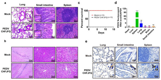 Clinical symptoms, survival curves, and pathological changes in mice challenged with PEDV CHFJFQ. (a,b) PEDV CHFJFQ caused lung and liver injury as well as intestinal villus atrophy in mice. Hematoxylin–eosin (H&E) staining was used to observe the pathological changes in mice induced by PEDV CHFJFQ infection at 72 hpi (n = 5). (c) Survival curves of mice challenged with PEDV CHFJFQ (n = 10). (d) The relative content of the PEDV CHFJFQ N gene in each organ was detected by RT-qPCR (n = 5). (e) Immunohistochemical detection of PEDV N protein expression in the lung, jejunum, and spleen at 72 hpi (n = 5). Mice in the PEDV infection group were orally inoculated with 5 × 105 TCID50 of PEDV CHFJFQ (0.1 mL), while the control group received the same volume of DMEM. Unpaired t-tests (GraphPad Prism 5.0, GraphPad Software, San Diego, CA, USA) were used to test differences between groups. Data are presented as means ± standard error of the mean for each treatment. **** p < 0.0001 vs. control group (liver), ns: p > 0.05 vs. control group (liver), ND: none detected. Sample sizes are indicated in brackets.