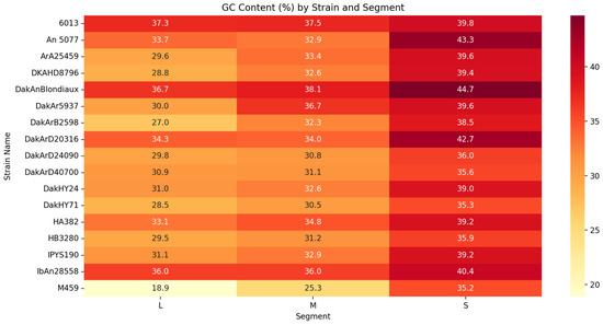 The GC content analysis revealed distinct segment-specific and strain-specific patterns, with the S segment consistently showing higher GC content. This suggests that the structural proteins encoded by the S segment might be under evolutionary pressure to maintain genomic stability and facilitate immune evasion. Strains like DakAnBlondiaux and An 5077 exhibit uniformly high GC content across segments, which might enhance their stability and adaptability. In contrast, strains such as M459 demonstrate notably low GC content, particularly in the L segment, possibly reflecting an alternative adaptation strategy. These findings highlight the potential link between GC content and pathogenicity, where higher GC content may enhance genome resilience, while lower GC content might confer flexibility in host adaptation [33].