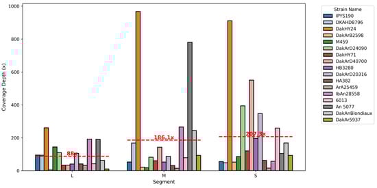Sequencing coverage depth varied significantly across strains and segments, ranging from 5.55X in the L segment of DakArB2598 to 967.52X in the M segment of DakHY24. On average, the S segments showed the highest coverage depths, as indicated by the annotated mean coverage lines in Figure 2. Strain-specific coverage trends were also observed, with DKAHD8796 demonstrating exceptional depth in the M segment, while IPYS190 exhibited consistent coverage across all segments. These patterns underline the robustness of the sequencing data and highlight genomic regions of particular interest for further study.