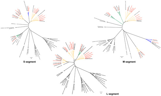 Phylogenetic relationships of Orthobunyaviruses across genomic segments. Maximum-likelihood phylogenetic trees for L, M, and S segments, revealing evolutionary ties to well-characterized pathogenic viruses. Each segment was assessed independently to explore genetic diversity and phylogenetic positioning. Bootstrap values indicate the confidence of clustering, with reference sequences from known Orthobunyaviruses included for comparison. Strains analyzed in this study are highlighted in red, showing their placement within the broader Orthobunyavirus phylogeny. Branch colors indicate virus associations: yellow for human-associated viruses, green for zoonotic viruses, and blue for non-vertebrate-associated viruses.