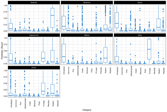 Using the VHP, we analyzed the genomic sequences of seven neglected OBV strains (ILEV, BWAV, INGV, SIMV, SABOV, MPOV, and BOTV) to predict their potential reservoir hosts and arthropod vectors. While initial efforts included SANV and TANV, these taxa were ultimately excluded from the analysis due to QC constraints that affected their suitability for robust predictions. Predictions were based on the average output for each genomic segment (L, M, and S) across all strains within a given taxon, using the BPS metric as a confidence measure. BPS values above 0.8 were considered high confidence, ensuring that only strong associations were highlighted. Each individual prediction score corresponds to a specific genomic segment’s likelihood of association with a given host or vector category. The boxplots in Figure 4 and Figure 5 illustrate the distribution of the prediction scores, while the individual points represent the probability assigned to each genomic segment (L, M, S) of a given viral strain.