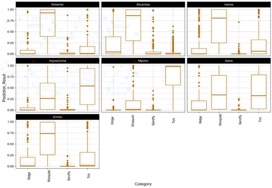 Mosquitoes emerged as the most strongly associated vectors for the majority of strains (Figure 5). Viruses such as BOTV, BWAV, ILEV, and SIMV exhibited high-confidence predictions for mosquito vectors, aligning with their known ecological roles in Orthobunyavirus transmission. Ticks were identified as secondary vectors, with MPOV showing a notable association. Moderate to high probabilities for tick vectors suggest their potential role in this strain’s transmission. Midges showed generally low prediction probabilities across most strains, except for minor associations with certain viruses. Similarly, predictions for sandflies were minimal, with almost no confidence across strains. Ambiguous or mixed predictions were observed for some viruses, reflecting ecological complexity. For instance, INGV exhibited overlapping probabilities for both mosquitoes and ticks, suggesting dual transmission ecology. Similar patterns, though to a lesser extent, were observed for ILEV and SABOV.
