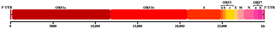Figure 1. Schematic diagrams of the FCoV genome comprising the 5’ untranslated region (5’ UTR), open reading frames ORF1a/1b, spike (S) gene, ORF3abc, envelope (E), membrane (M), nucleocapsid (N), ORF7ab, and 3’ untranslated region (3’ UTR).