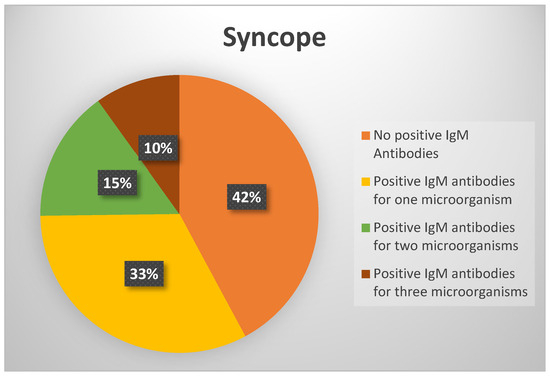 Among patients with syncope but without OH, 57.85% had positive IgM antibodies to at least one microorganism, with 15% having positive IgM antibodies to two microorganisms and 10% to three or more. The highest percentage of positive IgM antibodies was for Borrelia spp. (14.5%). These patients did not exhibit signs of atrioventricular (AV) block on repeated ECG monitoring, excluding cardiogenic syncope and the need for pacemaker implantation.