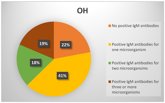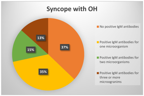 In the group with syncope and OH, 63% had positive IgM antibodies, with 15% positive for two microorganisms and 10% for three or more. The group with only OH, without a history of syncope, had the highest percentage of positive IgM antibodies (78%), including the highest percentages of IgM antibodies for two microorganisms (18%) and for three or more microorganisms (19%).
