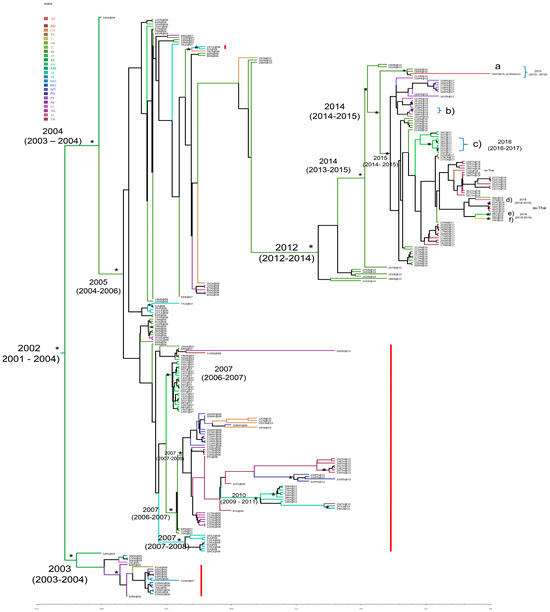 Cluster a (pp = 1), including three sequences from India and one from Austria-ex Maldives (39AT@19), dated back to the end of 2015 (95% HPD: 2015–2016), originating in India (sp = 0.99). Cluster b included two isolates from Pakistan dating back to 2016, while cluster c included seven isolates from Italy dating back to the year 2016 (95% HPD: 2016–2017, with the most probable location being Italy sp = 0.99). The other three statistically supported clusters (d, e, and f) can be identified in Figure 1: cluster d (pp = 0.97), including two sequences from Austria ex-Thailand, dated back to the end of the year 2018 (95% HPD: 2018.71–2019); cluster e (pp = 0.89), composed of two sequences from Italy ex Thailand dating back to the end of 2018 (2018.99 with 95% HPD: 2018.53–2019); and the last (pp = 1) including two sequences from Finland ex Thailand also dating back to the end of the year 2018 (95% HPD: 2018–2019). The phylogeographic analysis confirmed the African origin of the CHIKV ECSA genotype, in Kenya. From there, the spread subsequently involved two distinct routes: one throughout the Indian Ocean (Reunion and Comoros) and the other moving towards India; from India, it then scattered in South East Asia, reaching Italy at the end of 2006–beginning 2007 (Figure S2). Then, the circulation continued both from India towards other Asian countries (i.e., Sri Lanka, Singapore, Malaysia, Bangladesh, and China), among Asian countries (i.e., from Malaysia to China, from Singapore to Thailand, from Thailand to Cambodia, from China to India, from Cambodia to Laos, and from Cambodia to Thailand) but also involving other links, i.e., from Thailand to Papua New Guinea (Figure S2).