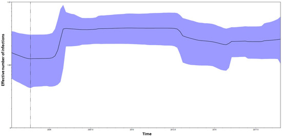 The Bayesian skyline plot performed on the E1 CHIKV dataset (Figure 2) showed growth in the effective number of the infections between 2005 and until middle 2007. After a constant phase, a mild reduction in the effective number of the infections starting from mid-2012 until 2015 was observed. Starting from 2015, a mild growth of the curve was observed.