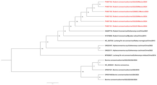 Among the animals most adapted to human environments are rodents [2]. Rodents have rapidly and efficiently adjusted to urban environments, reaching numbers that surpass human populations in the largest cities worldwide [3]. Rodents often flourish where food is abundant such as on livestock farms [4]. In large livestock farms, large populations of rodents have a higher probability of exchanging their pathogens with large populations of livestock. This continuous fluid exchange of pathogens constitutes a training ground for the genetic-driven adaptation of microorganisms [5]. Viruses in the Coronaviridae family are remarkable for their large RNA genomes and their tendency to generate novel strains that occasionally spill over to infect new species and cause epidemics [6,7,8]. The Coronaviridae family is classified into four genera: Alphacoronavirus, Betacoronavirus, Gammacoronavirus, and Deltacoronavirus. Viruses that belong to the genera Alphacoronavirus and Betacoronavirus typically infect both humans and animals, including rodents, while those of the genera Gammacoronavirus and Deltacoronavirus are associated with avian species but can also infect mammals. Among the Betacoronaviruses, Middle East Respiratory Syndrome Coronavirus (MERS-CoV), Severe Acute Respiratory Syndrome Coronavirus (SARS-CoV), and Severe Acute Respiratory Syndrome Coronavirus 2 (SARS-CoV-2) have recently caused epidemics and pandemics [9,10]. Growing attention has been focused on coronaviruses since the emergence of SARS-CoV, MERS-CoV, and SARS-CoV-2 due to their public health significance. In conducting surveillance for novel respiratory viruses that may be associated with sick livestock, we studied nasal swabs from sick and healthy cattle, as well as aerosol samples collected from various US and Mexican farms.