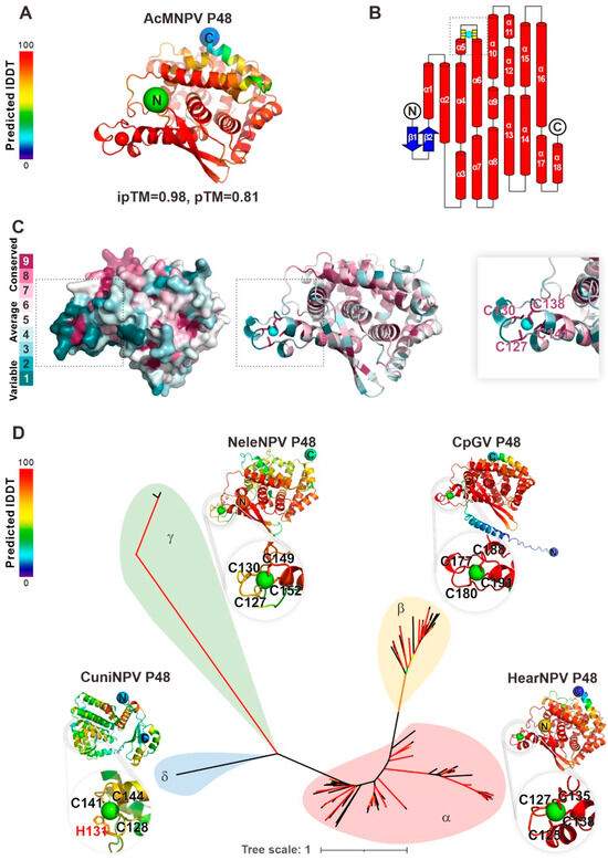 Amino acid sequence alignment of 168 available P48 homologs from baculoviruses was performed using MAFFT v7.453 software [7]. Phylogenetic analysis of P48 homologs was performed using IQ-TREE [8]. The best-fit model was determined using the ModelFinder algorithm within IQ-TREE 1.6.12, and 1000 ultrafast bootstrap replicates were used to assess the reliability of the tree. The three-dimensional (3D) model of P48 homologs was predicted de novo using the AlphaFold3 server [9]. The domain topology of AcMNPV P48 was generated using TopDraw -Version: Sep 2002 [10], and functional domains were predicted using the Dali [11] and Foldseek servers [12], respectively. To analyze the evolutionary conservation of P48, the alignment was submitted to the Consurf server [13,14] to obtain conservation scores for each residue. These scores were mapped onto the protein structure to identify conserved regions relevant to the function of P48.