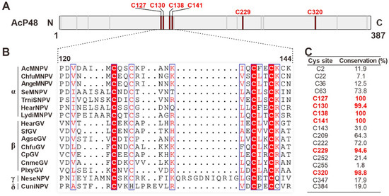 Conserved cysteines in P48 homologs. (A) Diagram of the primary sequence of AcMNPV P48. The locations of cysteines are indicated with short lines, with the highly conserved cysteines indicated as thick red lines. (B) Sequence alignment of P48 homologs from representative viruses from baculoviruses; only the region covering the zinc finger motif is presented. The sequences were aligned with MAFFT and edited with ESPript. Conserved cysteine sites are highlighted in red. (C) The conservation of each cysteine residue (shown in percentages from a total of 168 P48 homologs) in P48 is listed in the table. Sites with conservation greater than 90 are indicated in red.