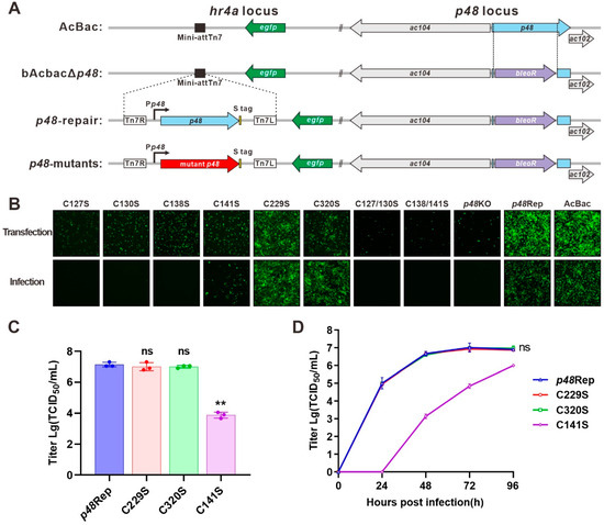 Construction and transfection–infection assay of recombinant bacmids. (A) Schematic diagram of recombinant virus construction. The p48KO bacmid was constructed by substituting p48 in the AcBac-Syn (AcBac) bacmid with a bleoR cassette. The recombinant bacmids were constructed by integrating S-tagged p48 or S-tagged mutant p48 into the hr4a locus. (B) Transfection–infection assay. Sf9 cells were transfected with each recombinant bacmid. At 96 h post-transfection (p.t.), supernatants were collected and used to infect healthy Sf9 cells. Fluorescence microscopy images were captured at 96 h p.t. and 96 h post-infection (p.i.). (C) P0 viral titers of C141S, C229S, C320S, and p48Rep determined by the endpoint dilution method. Statistical analysis was conducted using Student’s t-test to compare the titer between each virus and the repair control. ns, not significant. ** p < 0.001. (D) Growth curve analysis. C229S, C320S, and p48Rep were analyzed at an MOI of 5, while C141S was analyzed at an MOI of 0.02. Statistical analysis was conducted using Student’s t-test to compare the titer at 96 h p.i. between each virus and the repair control. ns, not significant.