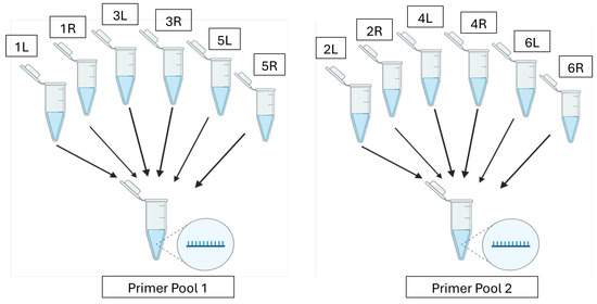 Odd-numbered forward (L) and reverse (R) primers are combined to make Primer Pool 1 and even-numbered forward (L) and reverse (R) primers are combined to make Primer Pool 2.