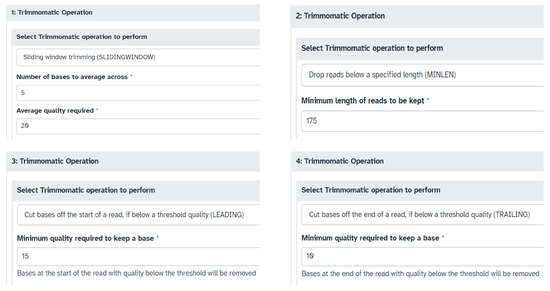 Recombinant baculovirus tiled-amplicon sequencing reads were processed and analyzed using the Galaxy online platform (https://usegalaxy.org/, accessed on 28 November 2023). Reference genome(s), Illumina adapter sequences, and forward (R1) and reverse (R2) raw read files were uploaded to the server, followed by an assessment of read quality performed using the FastQC tool (Galaxy Version 0.74+galaxy1). The Trimmomatic tool (Galaxy Version 0.39+galaxy2) was then used to trim the paired-end reads by selecting the ILLUMINACLIP step for custom adapter removal and performing 4 Trimmomatic Operations (SLIDINGWINDOW: 5:20, MINLEN: 175, LEADING: 15, TRAILING: 10) (Figure 2). The parameters of the Trimmomatic Operations can be changed if needed. Using FastQC, the quality of trimmed paired reads was analyzed and the files passed the adapter content criteria. The BWA-MEM2 tool (Galaxy Version 2.2.1+galaxy1) was used to build an index and map the forward and reverse trimmed paired reads to a genome from its history (reference genome). Optionally, samtools depth (Galaxy Version 1.15.1+galaxy2) could be run on the bam file to obtain the read depth at each position. An automated genome assembly tool, Pilon (Galaxy Version 1.20.1), then aligned the bam file (BWA-MEM2 alignment file) of one sample at a time with the reference genome to generate a Pilon-assembled genome. Following this, the DNAdiff tool (Galaxy Version 4.0.0+galaxy1) was used to evaluate similarities and differences between the Pilon assembled genome of each sample and the reference genome. Lastly, all the FASTA files were downloaded and pasted into a single file for visualization of genome alignments and identification of indel mutations performed by the MAFFT version 7 server (https://mafft.cbrc.jp/alignment/server/, accessed on 28 November 2023) [30].