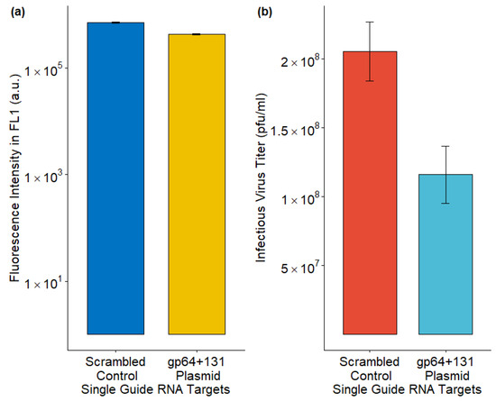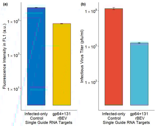 Impact of sgRNA rBEV-mediated gp64 gene disruption on (a) foreign protein production and (b) infectious virus titer. The data from 3 replicates are presented here.