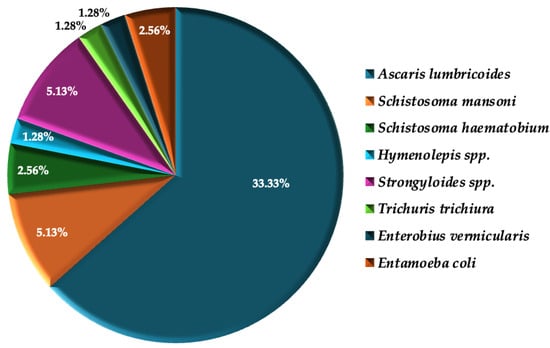 Ascaris lumbricoides was the most prevalent parasitic infection (n = 26, 33.33%). Other helminth species identified included Strongyloides species (n = 4, 5.13%), Schistosoma mansoni (n = 4, 5.13%), and Schistosoma haematobium (n = 2, 2.56%). Additionally, Hymenolepis species, Trichuris trichiura, and Enterobius vermicularis were each detected (n = 1, 1.28% each). Notably, some individuals harbored multiple species, such as two participants co-infected with Ascaris lumbricoides and Entamoeba coli. However, infections with Entamoeba coli alone were excluded from the analysis. Percentages are based on the number of participants infected with each species, not the total number of infections, as some individuals harbored multiple species.