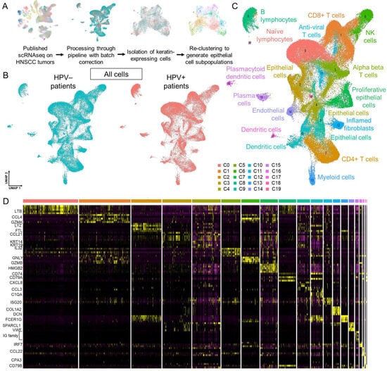 Joint analysis of HPV+ and HPV− HNSCC tumors with batch correction. (A) Overview of the bioinformatic pipeline to identify transcriptomically distinct epithelial subpopulations in scRNAseq data of HPV+ (n = 6) and HPV− (n = 9) HNSCCs. (B) Resulting UMAP of all cells separated by patient HPV status. (C) Cell clustering demonstrates a mix of immune, epithelial, and stromal cell types. (D) Heatmap of transcriptomically distinct clusters with select genes labeled.