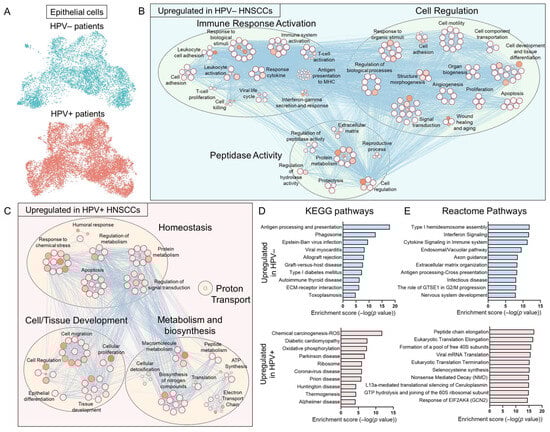 Signatures upregulated in epithelial cells from HPV+ and HPV− HNSCCs. (A) UMAP of keratinocytes isolated from the published scRNAseq data and re-clustered, separated by HPV status to show extensive overlap. (B–D) Global differential expression analysis by HPV status. (B) Cytoscape visualization of GO biological processes upregulated in HPV− vs. HPV+ HNSCCs reveals pathways related to immune activation, peptidase activity, and processes such as adhesion, angiogenesis, and apoptosis. (C) Cytoscape visualization of GO biological processes upregulated in HPV+ HNSCCs includes pathways related to metabolism, migration, and differentiation. Top 10 KEGG pathways (D) and reactome pathways (E) upregulated in HPV− and HPV+ HNSCCs.