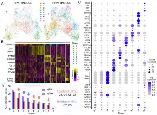 Epithelial subpopulations were identified by unbiased clustering (UMAP Figure 3A, heatmap Figure 3B, dot plot Figure 3C. Cells from both HPV+ and HPV− HNSCCs were represented in all subpopulations. Enrichment (defined as ≥30% difference by cell number) of subpopulations in HPV+ versus HPV− HNSCCs was determined by analyzing the distribution of tumor cells across clusters (Figure 3D, arrows indicating enrichment). C1, C4, C5, C7 were found to be enriched in HPV+ HNSCCs, C2 and C3 in HPV− HNSCCs, and C0 and C6 were roughly equally represented in HPV+ and HPV− HNSCCs. C8 had too few cells to be confidently assessed. Each cluster/subpopulation was defined by a distinct transcriptomic profile, although in some subpopulations, there were differences in the signature between HPV+ and HPV− specimens (heatmap, Figure S2).